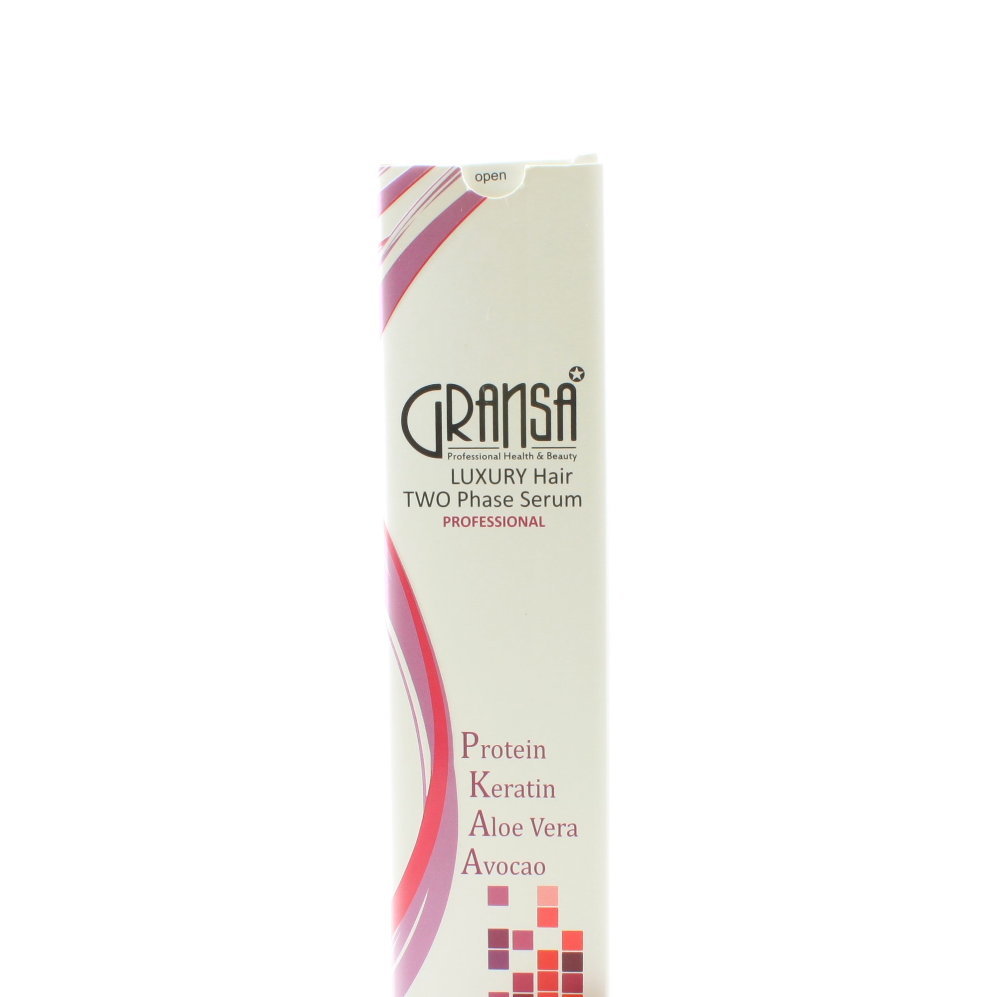 سرم دو فاز گرانسا بهترین سرم برای حالت دادن مو به موهای آسیب دیده و رنگ شده است. این سرم را قبل از سشوار و یا اتو استفاده کنید. کراتین بکار رفته در این سرم از موهای شما در مقابل حرارت محافظت میکند و خشمی و ایجاد موخوره را درمان می کند . پروتئین و ویتامین ب موجود در این محصول باعث تقویت و ترمیم موهای آسیب دیده می شود . جوانه گندم و عصاره آلوئه ورا و آووکادو در این سرم لطافت ، نرمی و درخشش به موهای شما می بخشد . فاز اول این سرم باعث ترمیم و تغذیه لایه خارجی و افزایش حالت پذیری مو می شود . فاز دوم سرم گرانسا قسمت های عمیق مو که در اثر رنگ ، دکلره و ... آسیب دیده است را ترمیم کرده و از ایجاد الکتریسیته ساکن بین تارهای مو جلوگیری می کند .