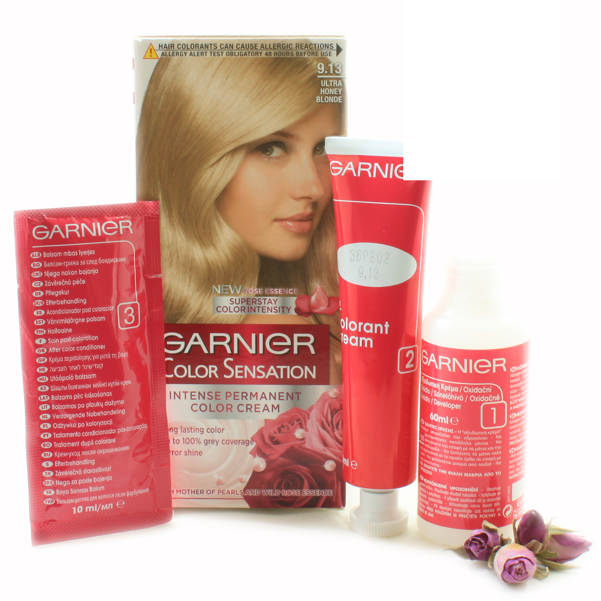 9.13 بلوند بژ براق این رنگ موی خاص گارنیر باید با پایه  دکلره 11 بر روی موها استفاده شود برای  دکلره کردنی که موهای را از انواع هاله های مزاحم مانند قرمز و زرد خلاص کند پودر سبز و سفید دکلره را همراه با اکسیدان ضد قرمزی ترکیب کنید و 45 دقیقه روی موهای خود نگه دارید سپس ترکیب اکسیدان و رنگ موی داخل جعبه را باید 40 دقیقه روی موی خود نگهدارید.