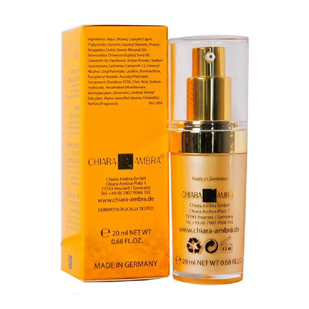 کرم دور چشم آمبر کیارا آمبرا موجب کاهش عمق چین و چروک های دور چشم تا بیش از ۴۲ درصد ظرف مدت ۴هفته می شود. طبق دستور تهیه بسیار قدیمی از پودر خالص سنگ کهربا تهیه شده است.کرم دورچشم کیارا آمبرا کرمی برای مراقبت ویژه از نواحی حساس دور چشم است. روغن های گیاه جوجوبا و بادام شیرین کمک بسیاری به متعادل کردن میزان رطوبت کرده و جلوه ای زیبا به پوست می بخشند. دی پانتنول نه تنها پوست را صیقلی و صاف و لطیف می کند آن را پیراسته و از بافتهای آن محافظت می کنند. کرم دور چشم کیارا آمبرا به پوست شما جلوه ای شاداب و سرزنده بخشیده و مقاومت آن را تا حد چشمگیری می افزاید. آزمایش این کرم نیز نه تنها روی پوستهای معمولی بلکه روی پوستهای مشکل دار (از جمله پوستهای حساس و کهیر مزمن) با موفقیت بسیار همراه بوده است.