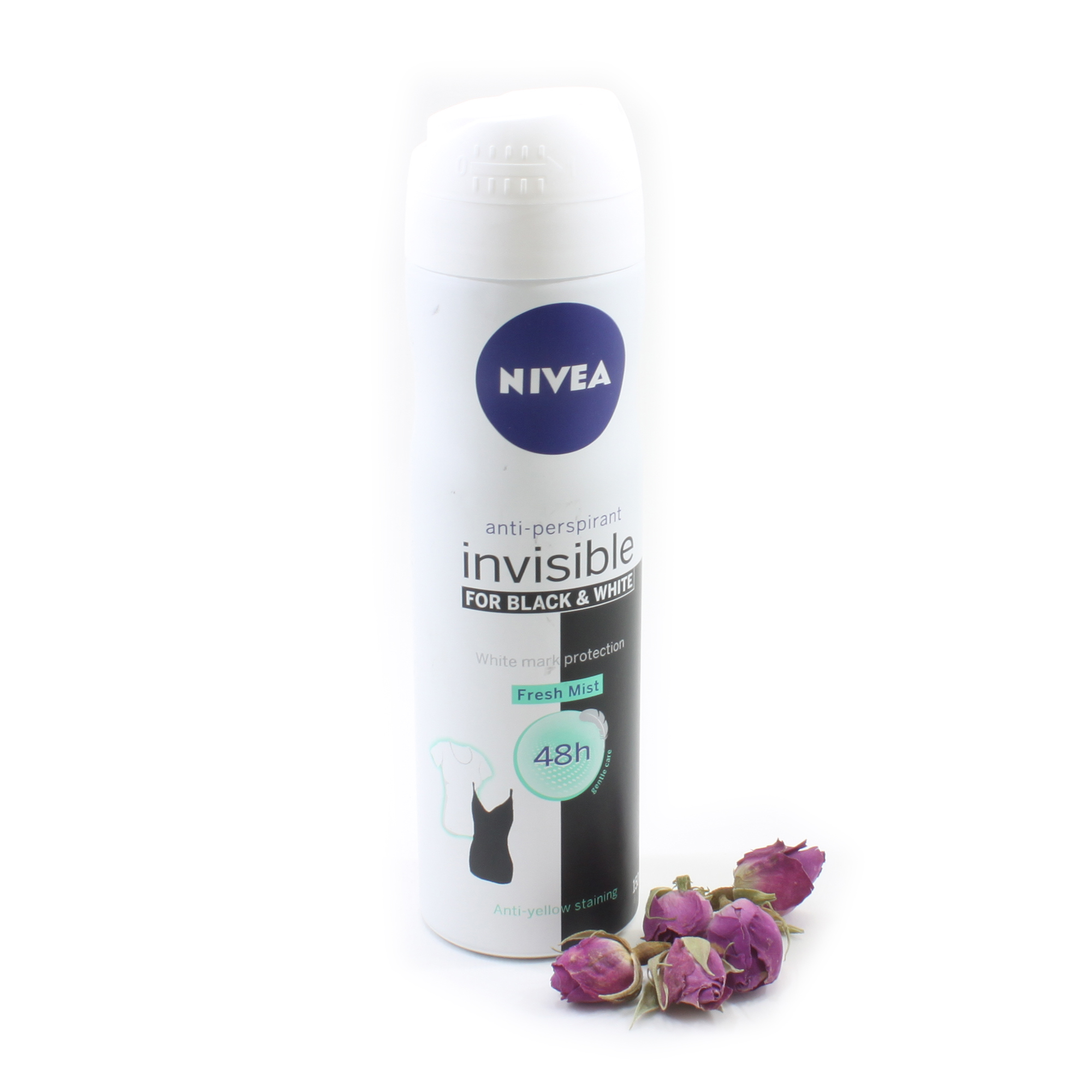 یکی از دلایل عمده در پیدایش بوی بد عرق این است که به میزان کافی حمام نمی‌کنیم. البته فقط شستشوی بدن کافی نیست، پاکی و نظافت لباس‌ها نیز در این مساله موثر است. استفاده از دئودورانت‌ها و ضدتعریق های استاندارد می‌تواند حداقل 20 درصد از میزان تعریق یک ناحیه را بکاهد. به طور کلی هدف از کاربرد مواد ضدعرق و بو، افزایش بهداشت فردی است. اسپری زنانه اینویزیبل فور بلک اند وایت فرش میست نیوآ با ماندگاری و محافظت 48 ساعته،مناسب لباس‌های تیره و روشن است و بدون ایجاد لک سفیدی بر روی لباس‌های تیره و لک زردی بر روی لباس‌های روشن حفاظتی تمام و کمال را برای مقابله با تعریق ایجاد می‌کند. این اسپری در حجم 150 میلی لیتری عرضه می‌شود.